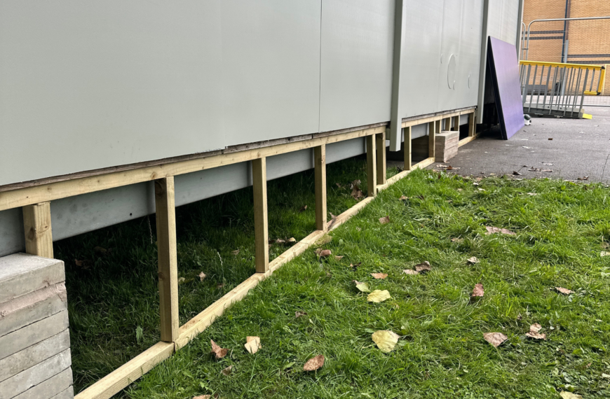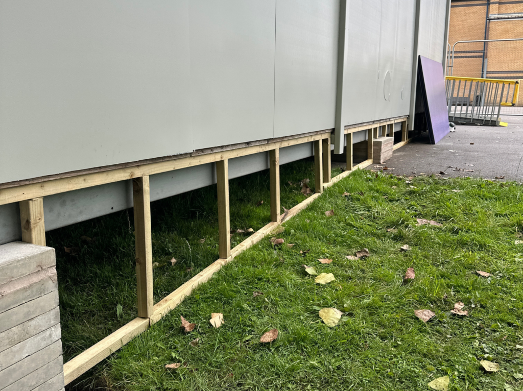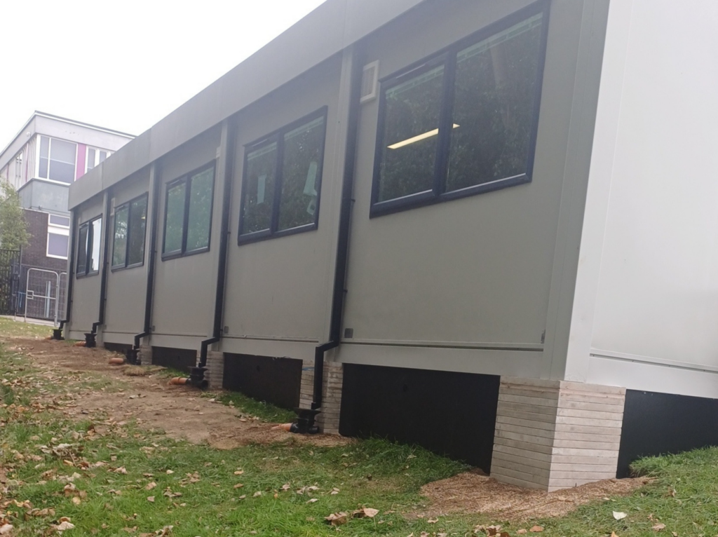 The scope covered installation of the foundation pads to receive the modular structure, drainage connections, electrical trenching across the site and concrete skirting works to the building perimeter. Access ramps were installed both before the crane lift and finished off after the building was in position, ensuring the structure was accessible and compliant from handover. All modular building groundworks were sequenced carefully around the crane programme so the installation team had a clean, fully prepared site to work from.