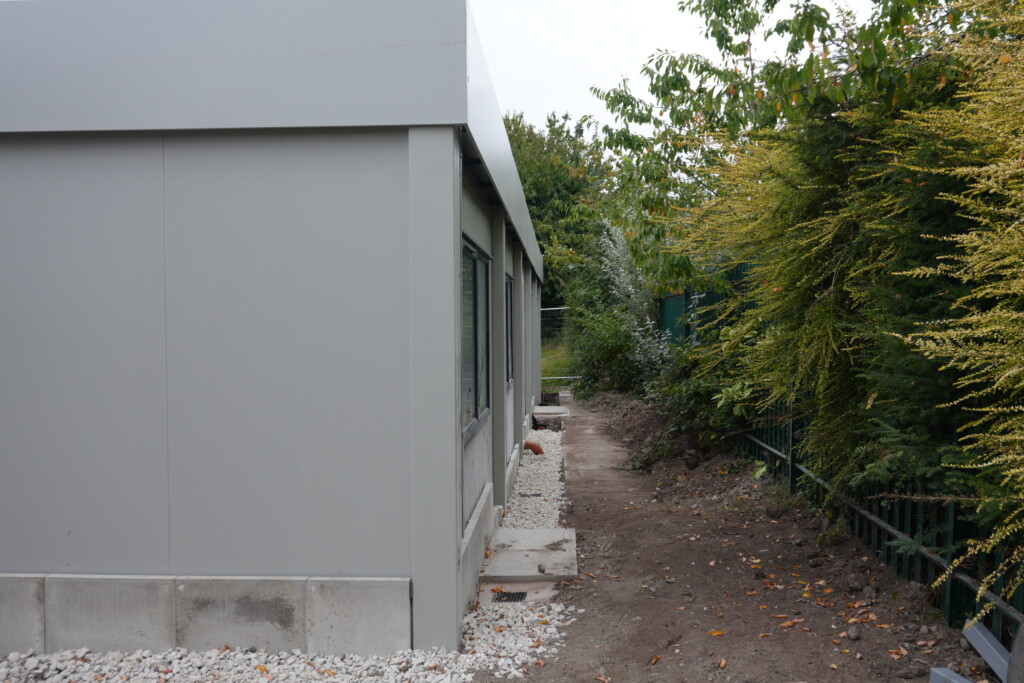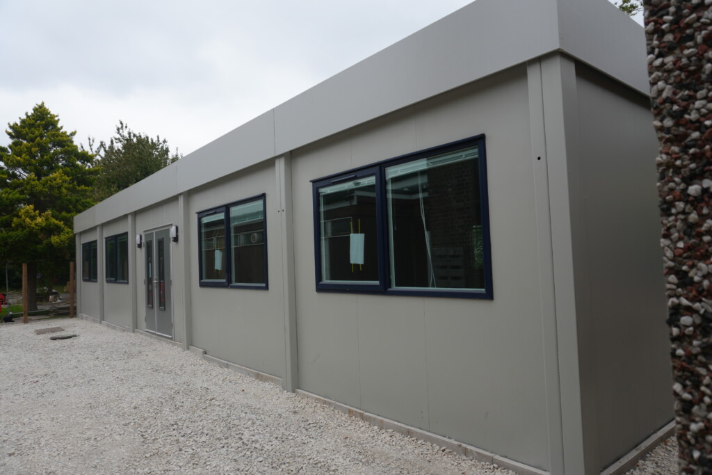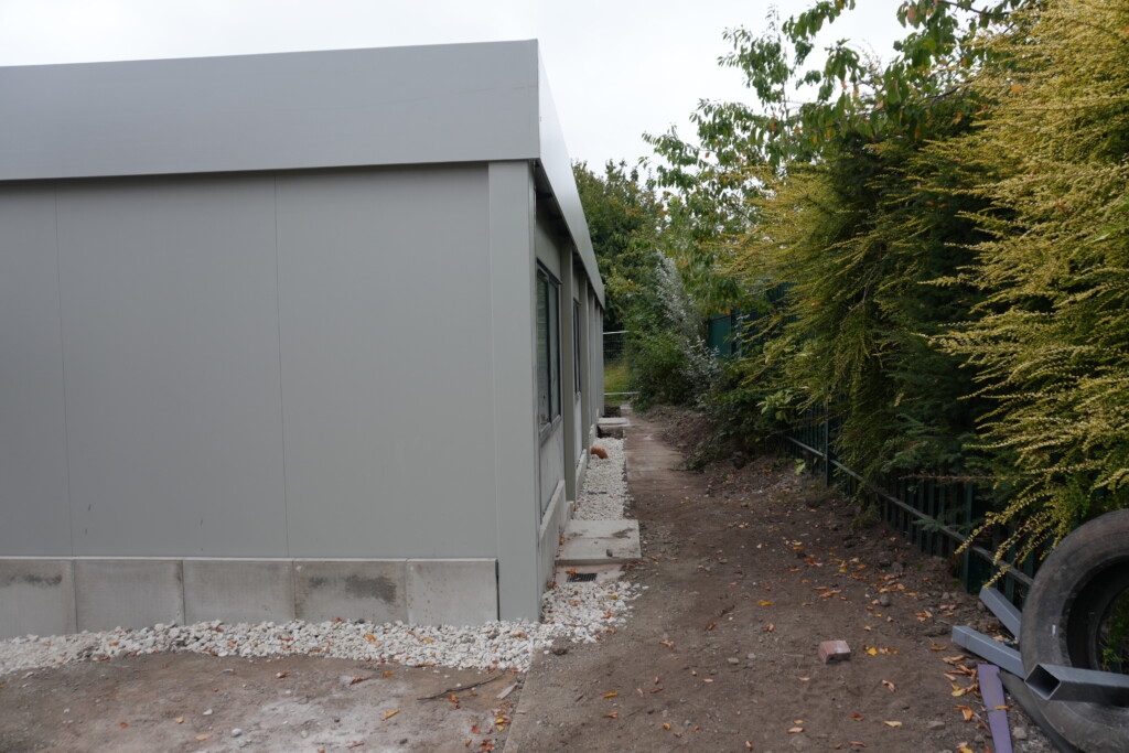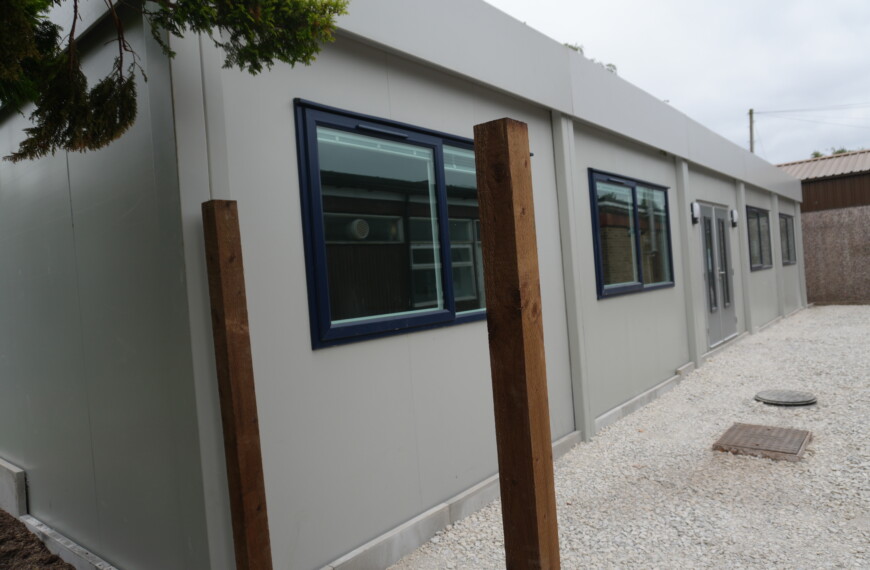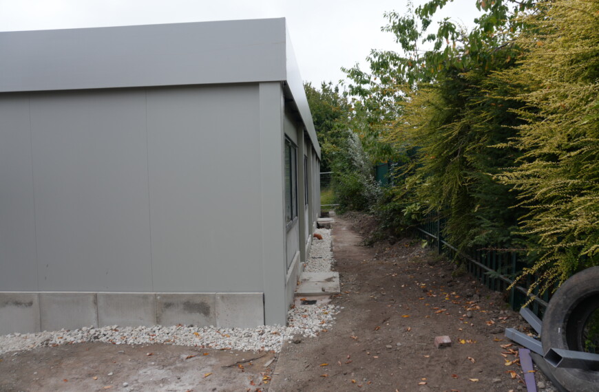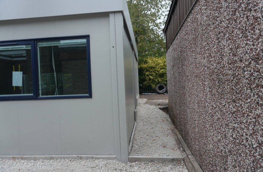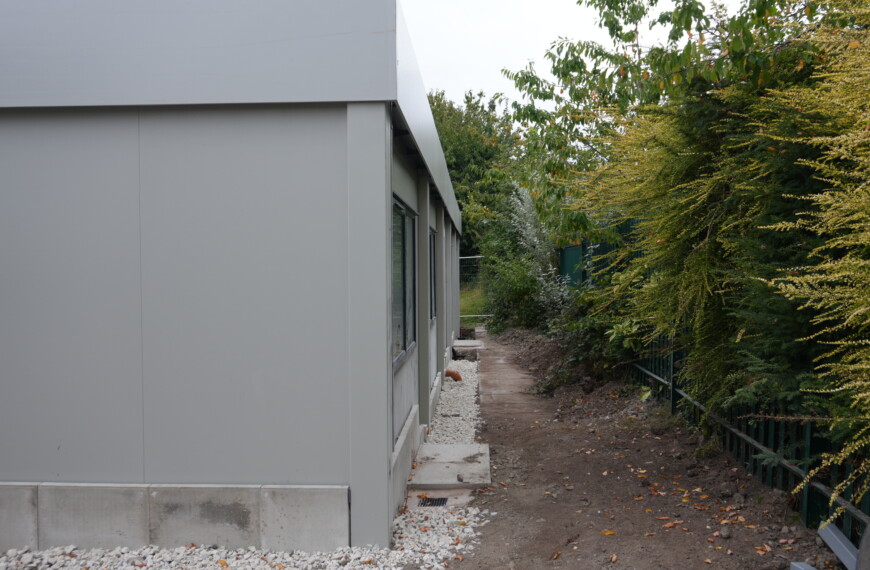 PKB installed the foundation pads to receive the modular structure, carried out all drainage connections and electrical trenching across the site, and completed the concrete skirting works around the building perimeter. Access ramps were installed both before and after the crane lift to ensure the building was accessible and compliant from day one. All trenching and external civils were completed in sequence around the crane programme to ensure the installation could proceed without delay.