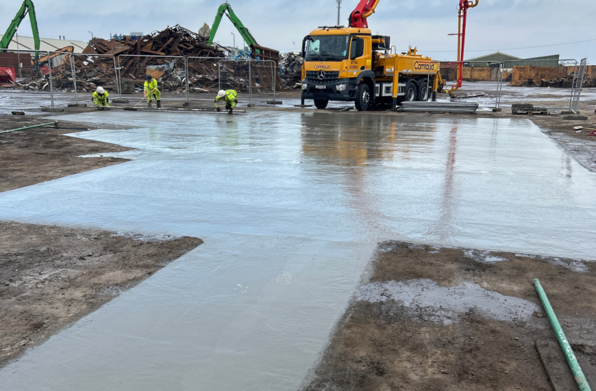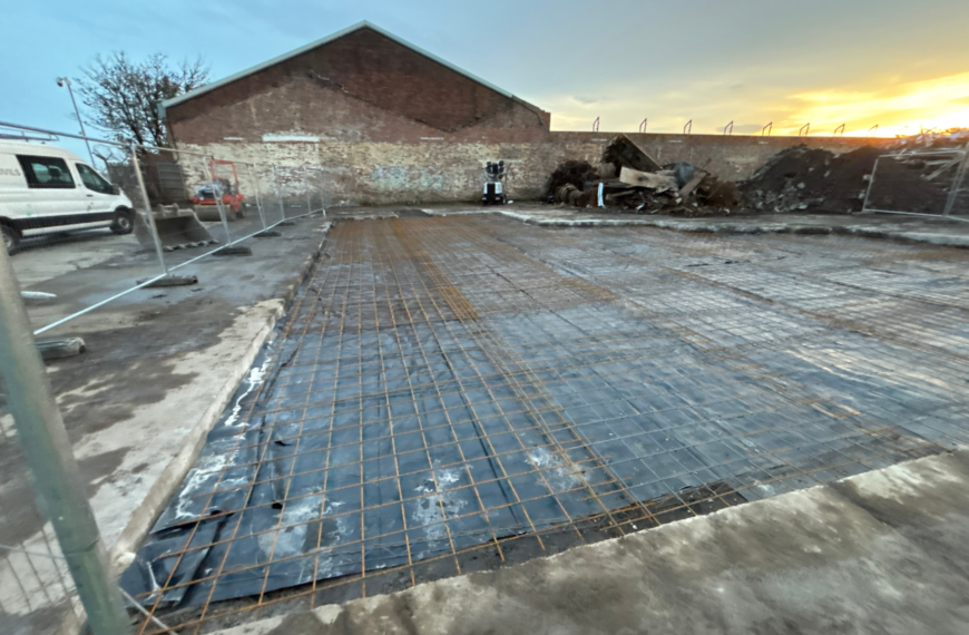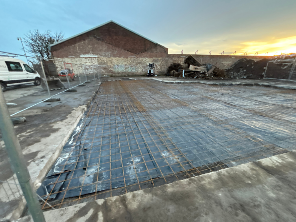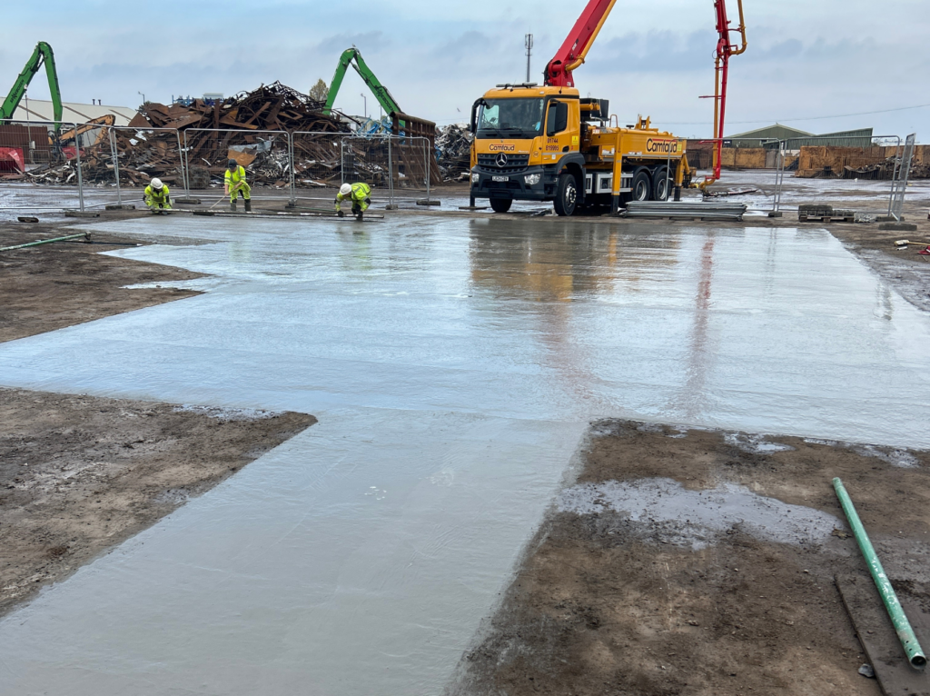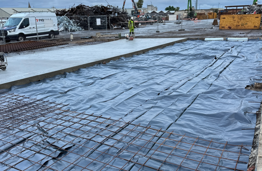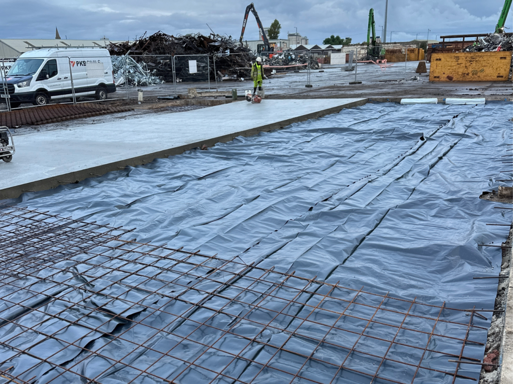 The works involved concrete repairs across the site, with up to 700m² of new concrete poured and reinforced with steel mesh throughout. Visqueen membrane was installed as part of the slab build-up across the yard to provide a robust, long-term solution suited to the conditions of a working recycling facility. The specification was chosen to ensure the recycling yard concrete repairs would perform reliably under constant vehicle and plant loading well into the future.