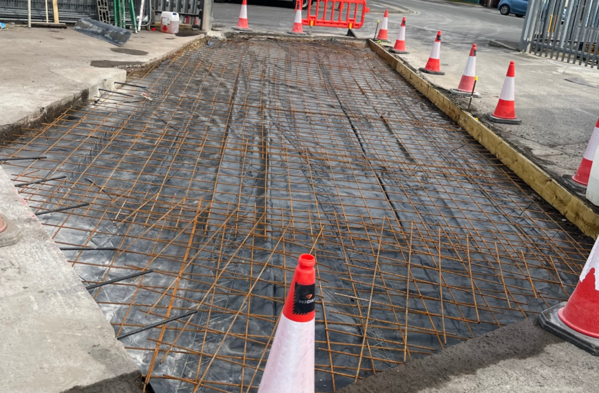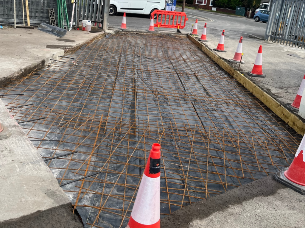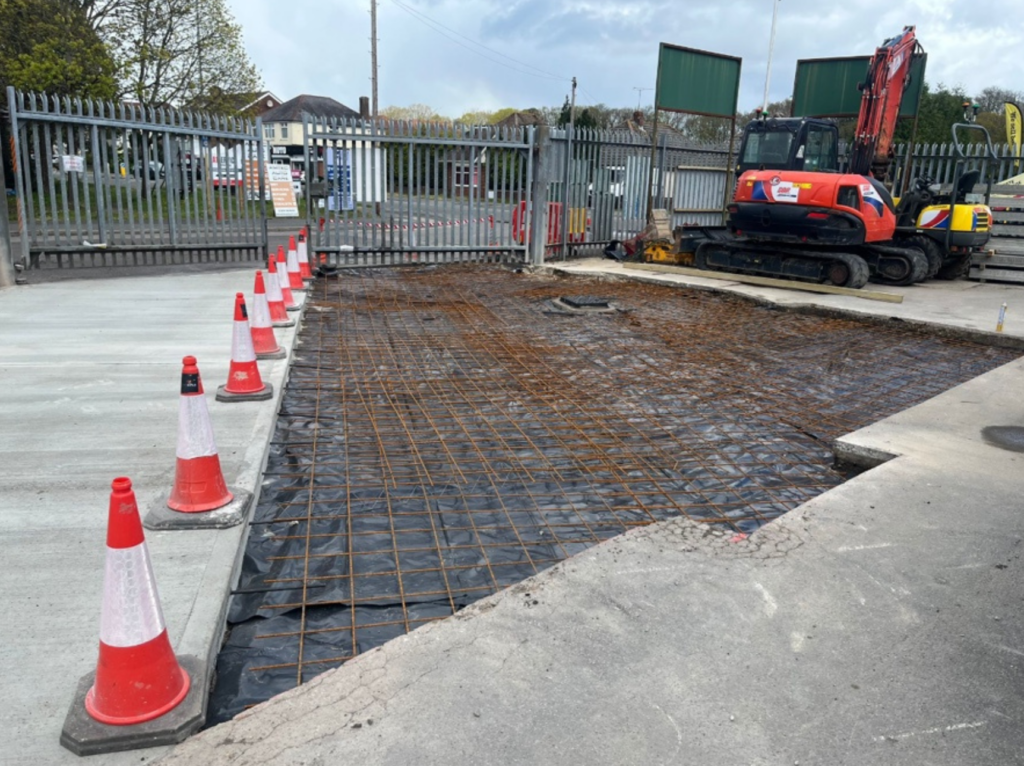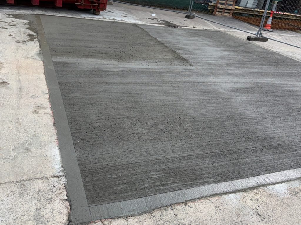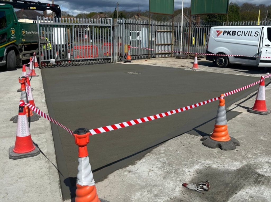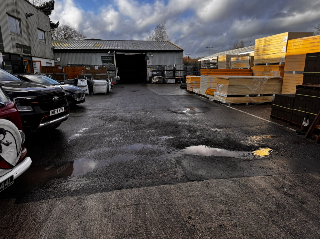 The works were split across two distinct locations on site. The first and larger area covered the yard entrance, where 137m² of concrete repairs were completed. To avoid disrupting the merchant’s day to day operations, PKB phased the entrance works carefully, splitting the area so vehicles could continue to gain access in and out of the yard throughout. The second area covered 50m² around the car park, which was repaired and resurfaced to bring it in line with the same standard. Across both areas, the new concrete was fully reinforced to ensure the builders merchant yard concrete repairs deliver long-term durability under ongoing vehicle loading.